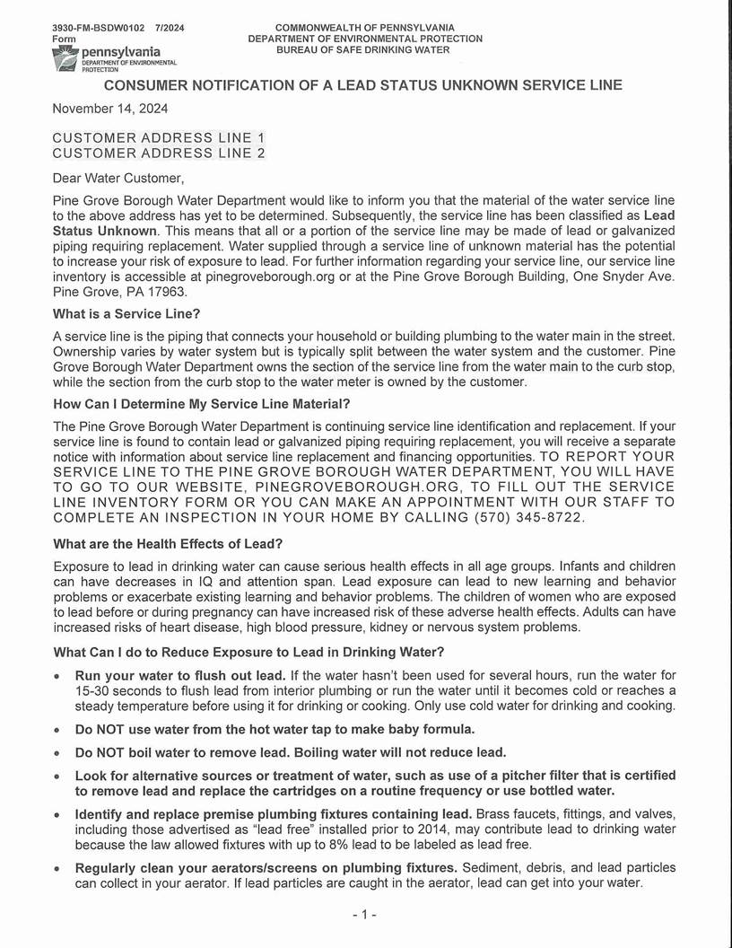 We are asking all water customers to verify what their water service line is and report it back to us in a timely manner. It could be copper, galvanized pipe, pex, etc. You can go onto our website at www.pinegroveborough.org and click on the DEP Service Line Inventory tab and submit the online form with the information, you may email us the information or if you are not sure what type of line you have you can request a time for one of our borough employees to come into your home and verify the type of line that you may have.